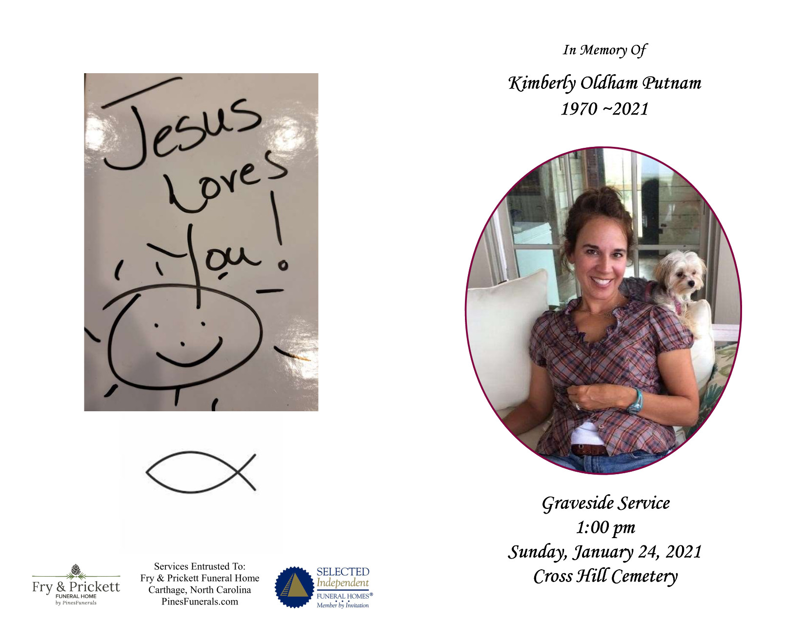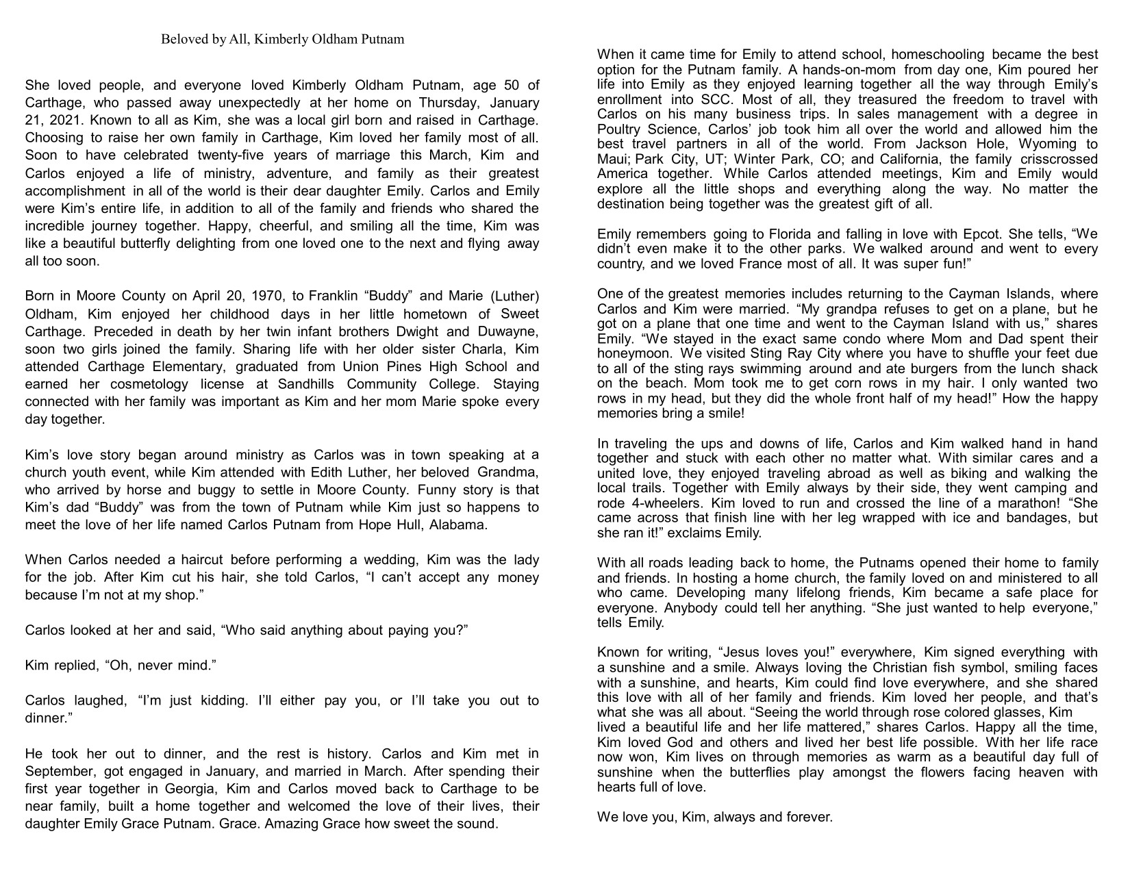 She loved people, and everyone loved Kimberly Oldham Putnam, age 50 of Carthage, who passed away unexpectedly at her home on Thursday, January 21, 2021. Known to all as Kim, she was a local girl born and raised in Carthage. Choosing to raise her own family in Carthage, Kim loved her family most of all. Soon to have celebrated twenty-five years of marriage this March, Kim and Carlos enjoyed a life of ministry, adventure, and family as their greatest accomplishment in all of the world is their dear daughter Emily. Carlos and Emily were Kim’s entire life, in addition to all of the family and friends who shared the incredible journey together. Happy, cheerful, and smiling all the time, Kim was like a beautiful butterfly delighting from one loved one to the next and flying away all too soon.